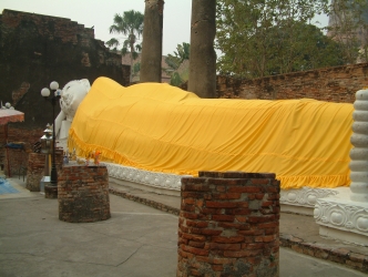 Beginn unserer 6-tägigen Rundreise. Nach dem Wecken um 5:00 Uhr packten wir unser Gepäck und stellten es vor die Tür. Um 6:00 Uhr gingen wir dann Frühstücken, so dass wir um 6:45 Uhr dann mit unserer großen Fahrt beginnen konnten. Unser erster Haltepunkt war eine Tempelanlage in Ayutthaya so gegen 7:30 Uhr. Wir sahen die Wohngebäude der Mönche. In der Regel leben dort bis zu 5 Menschen. Die Anlage war sehr gepflegt, überall sah man Personal das fegte putze und die Anlagen in Ordnung hielt. Wir liefen auf dem Hauptweg an einer 30 m. langen Buddhastatue (liegend) vorbei. Zum ersten Tempel, welchen wir besichtigten erklärte uns unser Reiseleiter, dass der große sitzende Mönch in seiner Urfarbe schwarz sei, jedoch mit Blattgold überzogen wurde. Die Thai kaufen in dafür vorgesehenen Geschäften Blattgold und bringen dies als Opfergabe an den Buddhastatue an. Wenn die Mönche Geld zur Erhaltung und Restauration der Anlagen benötigen, wird diese Goldschicht abgekratzt, eingeschmolzen und verkauft. In diesem Tempel sahen wir auch die erste Nonne. Auch die Frauen haben kahlrasierte Köpfe und tragen die gleichen Gewänder wie die Mönche, jedoch sind diese weiß. Um den Tempel betreten zu dürfen mussten wir unsere Schuhe ausziehen. Dies ist generell üblich, wenn man Tempel betritt. Aber auch in Geschäften oder in den privaten Häusern ziehen sich die Thai meist die Schuhe aus. Hätten wir das vorher gewusst, hätten wir uns nur Schlupfschuhe mitgenommen. Unser Reiseleiter erklärte uns auch, dass die Spitze Kappe, die die Thai-Buddhas auf dem Kopf haben Erleuchtungskappe genannt wird. Auch dass die Ziffer „9“ für die Thai eine Glückszahl ist. Deshalb sieht man auch viele Preise mit „99“. Dies ist nicht, wie bei uns in Deutschland, um Sonderpreise zu demonstrieren, sondern einfach nur, um Glück beim Verkauf der Artikel zu haben. Die Thai sind sehr abergläubisch. Auch in dieser Tempelanlage gab es so genannte Horoskopstäbchen. Diese sehen etwas aus wie das Mikadospiel nur dicker. Zudem sind sie mit Zeichen und Symbolen gezeichnet. Die Stäbchen werden geschüttelt und auf den Boden geworfen. Je nach dem, wie diese dann fallen, haben sie eine bestimmte Bedeutung. Ist der Werfer jedoch mit der Auslegung nicht einverstanden, wirft er einfach noch mal, bis es eben passt. So kann man sich seine eigene Zukunft natürlich auch positiv gestalten.