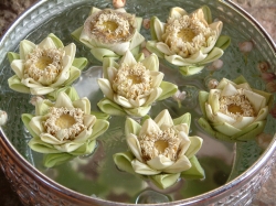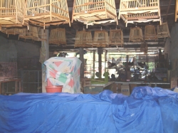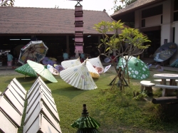 Um 12:30 Uhr machten wir uns auf den Weg zum Mittagessen im Golfclub. Das Gelände sah sehr vornehm aus, auch das Gebäude wo wir auf der Terrasse platz nahmen. Das Essen wurde in Buffetform gereicht. Allerdings war dies nicht überragend. In den meisten Behältern war sehr wenig drin, nachgefüllt wurde nicht. Der Geschmack war auch nicht überragend. Für dieses Ambiente war das essen wirklich nicht besonders. Hier habe ich die dreckigsten Toiletten von ganz Thailand gesehen. Alles in allem hätten wir in einer Garküche besser gegessen. Nach diesem nicht so vorzüglichen Mahl ging es weiter zur Handwerksstraße. Zuerst besichtigten wir eine Schmuckfabrik. Hier wurde uns zuerst ein Film über die Gewinnung und Verarbeitung von diversen Edelsteinen wie Rubinen, Diamanten, Smaragden usw. gezeigt. Danach konnten wir die Werkstatt besichtigen, wie diverse Schmuckstücke hergestellt werden. Ich hatte mich schon gewundert, warum hier so viel Personal durch die Gegend rennt. Als wir dann in den Verkaufsraum gefühlt wurden, war es mir klar. Man konnte sich keine Schmuckvitrine anschauen, ohne dass man (sogar auf deutsch) angesprochen wurde. Die wollten unbedingt was verkaufen. Ich kam mir vor, wie auf einer Kaffeefahrt. Dies war nicht sehr angenehm und so verließen Udo und ich auch sehr schnell diese Räumlichkeiten, obwohl sie wirklich schöne Sachen in den Vitrinen liegen hatten. Als wir wieder alle zusammen waren, ging es weiter zu einer Schirmfabrik. Hier wurde uns gezeigt, wie in mühseliger Handarbeit die schönen Papierschirme gefertigt wurden. Eine Arbeiterin erhält hier einen Tagelohn von 100 Baht. Auch werden die Schirme handbemalt, so dass jeder einzelne ein Unikat ist. Im großen Verkaufsraum haben wir dann auch eingekauft für zu Hause.