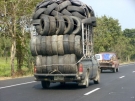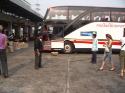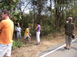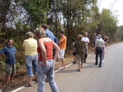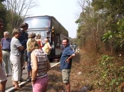 Dann ging die Fahrt weiter und endete so gegen 11.00 Uhr auf freier Strecke im Dschungel, als unser Bus den Geist aufgab. Zuerst versuchte unser Reiseleiter Tha Nu einen Ersatzbus über den Busunternehmer zu bekommen. Dieser sollte von der Busgesellschaft in Chiang Mai losgeschickt werden und in ca. 2 Stunden dann vor Ort sein, um uns aufzusammeln. Wir hatten uns gerade auf das Warten eingestellt und uns zum Pipi machen in den Dschungel verzogen (auch wegen der stechend heißen Sonne) da kam ein Linienbus, den Tha Nu anhielt. Nächste Instruktion: Wir fahren mit dem Linienbus nach Praeh. Dies war eine rasante Fahrt in einem übervollen Bus. Die Klimaanlage bestand aus offenen Fenstern und Ventilatoren an der Decke. Die Fahrt dauerte mit einer 15-Min.Pause ca. 1 Stunde.