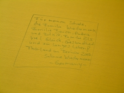 Trotzdem es drei Filme, Unmengen zu essen und trinken gab, waren wir beide froh, als wir endlich wieder festen Boden unter den Füßen hatten. In Frankfurt ging alles sehr zügig. Kaum waren wir durch die Passkontrolle, war auch schon unser Gepäck da. Beim Zoll fanden wir gar keine Beachtung. Wäre für uns auch kein Problem gewesen, da wir ja ganz ehrliche Menschen sind und Schmuggel für uns gar nicht in Frage kommt. Leider haben wir um 10 Minuten unseren Zug nach Karlsruhe verpasst, mit dem wir direkt hätten durchfahren können. Aber auch der nächste, bei dem wir einmal in Mannheim umsteigen mussten, kam schon 50 Minuten später. Wir riefen daheim an, damit Sepp und Hildegard rechtzeitig dann in Karlsruhe waren, um uns abzuholen. Um 10:30 Uhr waren wir dann endlich zu Hause. Unsere Katze hat sich gefreut, uns wieder zu sehen. Wir haben noch unser Gepäck ausgepackt, damit wir unsere Souvenirs zeigen konnten. Auch musste ich unbedingt noch einen richtigen Weinschoppen-Schorle trinken. Dann fielen wir total kaputt in unsere Betten. Wir wissen beide, wenn wir uns die Reise leisten können, werden wir sicher wieder nach Thailand gehen. Außerdem haben wir ja auch eine Einladung von Shu Pong aus Ayuttaya, die wir gerne mal besuchen wollen. Wir können Thailand nur jedem empfehlen. Und hoffen bald mal wieder bei unseren Freunden Urlaub in Thailand machen zu können.