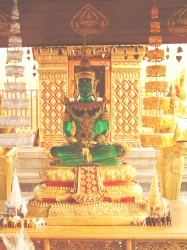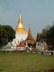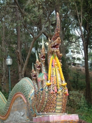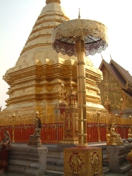 Hier wurden wir dieses Mal am Tisch bedient. Heute saß ein Ehepaar aus unserer Reisegruppe mit uns am Tisch, welches mit seiner ganzen 10köpfigen Familie aus Dänemark angereist war. Nur die Frau an unserem Tisch sprach deutsch, die anderen nur Dänisch. Der Grund ihrer Reise war, dass die Schwester der Frau zwei Thaikinder aus dem Waisenhaus in Pattaya adoptiert hatten. Die Großeltern wollten den Kindern, welche auch dabei waren, und sich ermöglichen, das Land kennen zu lernen, wo die kleinen herkamen und hatten die ganze Familie zur Reise eingeladen. Nach dem Essen, bei dem wir von Schülerinnen einer Hauswirtschaftsschule bedient wurden, traten wir wieder eine längere Busfahrt an, um 16:00 Uhr kamen wir dann im Hotel Chiang Mai Hills an und luden hier unsere Koffer aus, weil die Auffahrt zu unserem nächsten Ziel, dem Tempel auf dem Berg von Chiang Mai für den vollbeladenen Bus nicht zu machen gewesen wäre. Die Auffahrt führte uns über eine Serpentinenstraße dann zum Fuße eines 80 Jahre alten Tempels. Von unten konnte man die Treppen hochlaufen oder mit dem Lift fahren. Da wir einfach zu faul waren, die Treppen zu gehen, sind wir für 20 Baht nach oben gefahren. Die Tempelanlage war noch relativ jung, die Agoda in der Mitte jedoch bereits 600 Jahre alt. Ein wunderschöner Tempel mit viel, viel Gold und Marmor. Hier gab es einen äußeren und einen inneren Bereich. Der äußere Bereich war eher wie eine Parkanlage gestaltet mit überall Bugenvilas, Bäumen und Orchideen. Im inneren Bereich mussten wir wieder auf unsere Kleidung achten. Hier mussten wir auch die Schuhe ausziehen.Nach dem Durchgang durch das Innentor kamen wir auf einen Vorplatz, der mit glattem Marmor ausgelegt war. Unser Blick viel direkt auf die bereits genannte Agoda, über und über mit Gold verziert. Diesen Blick fanden wir später im Reiseführer und auf vielen Postkarten wieder. Nachdem unser Reiseführer über die Geschichte und die Architektur des Tempels erzählt hatte, gab er uns 30 Minuten zur freien Verfügung, um uns im Tempelinneren umzusehen. Außerdem wies er uns darauf hin, dass wir gerne zu einen Tempelraum gehen können, in dem ein Mönch sitzt, der die Vorsprechenden mit von Buddha geweihtem Wasser bestäubt und Wünsche und Gebete für die Vorsprechenden spricht. Weil man von guten Wünschen nie genug haben kann, sind wir natürlich gleich dort hin gegangen und konnten auch gleich vorsprechen. Wir empfingen kniend vor dem Mönch seinen Segen, wurden mit dem geweihten Wasser bespritzt. Zur Festigung der guten Wünsche erhielten wir noch jeder ein Baumwollarmband. Udo hatte das Privileg, dieses selbst vom Mönch an das rechte Handgelenk gebunden zu bekommen. Da Mönche ja Frauen nicht berühren dürfen, übernahm dies bei mir ein Assistent. Nachdem wir 20 Baht für den Tempel gespendet hatten, wurden wir entlassen. Tha Nu hat uns später gesagt, dass wir dieses Band nicht durchschneiden dürfen sondern warten müssen, bis es von alleine wegfällt, da es sonst Unglück bringt. Im Quadrat um die goldene Agoda war noch ein relativ großer Jadebudda zu besichtigen. Allerdings war es keine echte Jade, sondern grünes Glas. Sah aber trotzdem sehr schön aus. Nach den angesagten 30 Minuten machten wir uns auf den Weg nach unten zum Bus. Dieses Mal nahmen wir die Treppe. Das war auch toll, die Treppe war angelegt wie eine lange Schlange, deren Abschluss ein Drachen(Schlangen)kopf am Handlauf war. Sah richtig toll aus, so einmalig asiatisch. Auf dem Weg nach Unten gab es diverse Verkaufsstände. Hier wurden unter anderem frische Erdbeeren verkauft. Da diese wirklich schön aussahen, haben wir uns einen Becher (ca.200 gr.)für 10 Baht gekauft. Die Erdbeeren haben echt lecker geschmeckt. Am Treffpunkt mussten wir nicht lange auf unseren Bus warten.