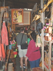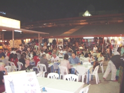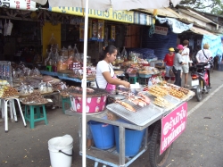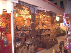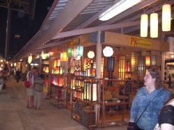Um 17:30 Uhr waren wir dann wieder in unserem Hotel. Bevor wir auf unser Zimmer gingen, haben wir uns mit einigen Mitgliedern unserer Reisegruppe verabredet, zum Nachtmarkt zu fahren. Unser Reiseleiter hat uns empfohlen, uns zusammen zu schließen und ein Sammeltaxi zu nehmen, da der Weg zum Laufen viel zu weit wäre und dies die billigste Fortbewegungsmöglichkeit ist. So haben wir es denn auch gemacht, um 19:00 Uhr trafen wir uns vor dem Hotel. Wir waren dann 9 Leute und die Fahrt war wieder ein Erlebnis mit einem rasanten Tempo durch die nächtlichen Straßen von Chiang Mai. Letztendlich kostete die Fahrt p.Person 15 Baht. Am Nachmarkt angekommen mussten wir uns erst mal zurecht finden. Der Name „Markt“ traf es nicht richtig, was wir da vorfanden. Ganze Straßenzüge waren hell beleuchtet und die Geschäfte geöffnet. Im mittleren Bereich des einen Straßenzuges fanden wir einen großen Platz, der mit Tischen und Stühlen bestellt war. Darum im Quadrat waren lauter Garküchen mit den verschiedensten Gerichten. Sogar Schweinshaxen hätte man hier essen können. Im Eingangsbereich zu diesem Schlemmerpalast stand eine Kasse, bei der man Gutscheine kaufen konnte, um sie dann an den einzelnen Küchen einzulösen. Etwas ungewöhnlich, aber durchaus praktisch. Wir fanden uns dann wieder mit den Bayern und Frau Panten wieder und aßen gemeinsam. Das Essen war wirklich gut. Danach machten wir uns wieder auf den Weg, um die vielen schönen Geschäfte anzuschauen und das eine oder andere Souvenir zu kaufen. Da hier Unmengen an Menschen unterwegs waren, trennten sich natürlich sehr schnell unsere Wege und wir machten einen Treffpunkt aus, von wo wir dann wieder zusammen zurück zum Hotel fahren wollten. Wir fanden Stände mit Holzschnitzereien, Läden mit Stoffen, Kleidern, Trödel, Plagiaten und Silberschmuck. Hier haben wir für unsere Julia ein schönes Armband aus Sterlingsilber mit Einlagen aus gefärbtem Muschenkalk gekauft. Das hat uns so sehr gefallen. Hoffentlich gefällt es ihr auch. Und natürlich gab es Unmengen an Krempel, welchen keiner braucht und trotzdem Abnehmer fand. So gegen 22.00 Uhr hatten wir so viele Eindrücke gesammelt, dass wir total erschöpft waren und uns auf den Weg zum vereinbarten Abfahrtsplatz machten. Hier wartete tatsächlich auch schon der eine oder andere. Als wir genügend Leute waren, fuhren wir zurück zu unserem Hotel und fielen todmüde in unsere Betten.