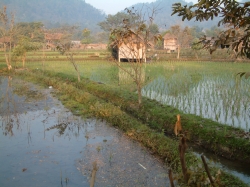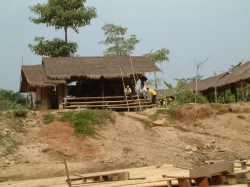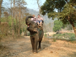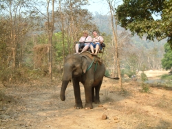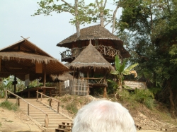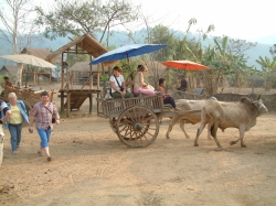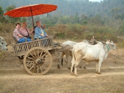 Um ca. 8.30 Uhr sind wir dann auch dort angekommen. Pah Nu hat uns aufgeteilt und uns den Ablauf des Vormittags erklärt. Zuerst wurden wir zu einer Art Aufgang geführt. Man muss sich das vorstellen, wie die Haltestelle einer S-Bahn. Von hier oben aus konnten wir ganz einfach in den vorgefahrenen Ochsenkarren einsteigen. Der Karren hatte Platz für max. 4 Personen, da in der Mitte noch ein großer Sonnenschirm angebracht war. Wir teilten uns unseren Karren mit den zwei Bayern. Und schon ging die Fahrt los über Stock und Stein. Natürlich hatte dieses Gefährt keine Federung. Ich hatte die größten Bedenken wegen Udo´s Rücken, aber die Fahrt verlief ohne größere Probleme für ihn. Auf jeden Fall hatten wir einen Heidenspaß. Der Kutscher hat zwischendrin sogar angehalten und mit unserem Fotoapparat fotografiert zur Erinnerung an diese lustige Fahrt. Das Panorama, welches uns geboten wurde, war einmalig. Ein Normadenvolk aus dem nördlichen Grenzgebiet hatte sich hier niedergelassen in primitiven Hütten auf Stelzen. Für ihre Nahrung hatten sie Reis angepflanzt. Sie lebten also fast in den Reisfeldern. Auch der dunstige Wald, welcher zu sehen war, bot ein einmaliges Panorama. Da wir noch so früh dran waren, war es noch nicht so heiß und wir konnten dieses einmalige Erlebnis richtig genießen. Nach einiger Zeit kamen wir dann am Wechselpunkt an, wo wir vom Ochsenkarren auf den Elefanten umstiegen.
