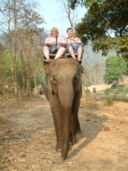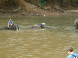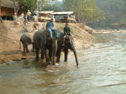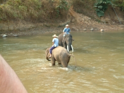 Auch hier hatten die Thai solche Rampen gebaut, dass man bequem auf den Elefanten aufsteigen konnte. Udo rannte zwischen den riesigen Tieren, die kreuz und quer herum marschierten zu der Rampe, dass es mir ganz anders wurde. Auf dem Rücken des Elefanten war ein Sitzgestell angebracht mit einer Sicherungsstange, so dass man sich wie in einem Riesenrad mit Haltegurt fühlte. Und schon ging der Ritt los. Der Mahut, der unseren Elefant führte, war höchstens 15 Jahre alt. Vorher hatte uns Pah Nu erzählt, das ein Mahut zusammen mit seinem Elefanten aufwächst und immer bei ihm bleibt. Der kleine Kerl hatte nur eine kurze Hose und ein T-Shirt an und saß auf dem Elefantenkopf, ohne sich irgendwo zu halten. Das war schon beeindruckend. Der Ritt war super. Das Tier ging gemächlich vor sich hin, bei Unebenheiten, oder wenn es extrem bergab oder bergauf ging, suchte es sachte und vorsichtig seinen Weg, bis es ganz sicher auf dem Boden stand. Auf dem Weg gab es verschiedene Posten, so hoch wie die Elefanten selbst gebaut. Hier verkaufte das Personal Elefantenfutter wie Bananen, Mandarinen, Zuckerrohr. Das wissenTiere natürlich. Auch wir haben für unseren Elefanten eingekauft. Als wir zum Fluss kamen, fing er an zu betteln in dem er den Rüssel nach oben streckte und schnupperte. Ich habe einen Schreck bekommen und gedacht, der spritzt uns jetzt nass. Aber unser Mahut hat uns gezeigt, dass er jetzt sein Leckerli wollte. Nachdem er das ganze Päckchen Zuckerrohr verdrückt hatte, marschierte er weiter durch den Fluss. Der Weg durch den Fluss übertraf den Ritt durch den Wald mit seinem Wasserfall um ein Vielfaches. Wir kamen uns vor, wie im Film. So was Tolles hatten wir beide noch nicht erlebt und das durfte mein Schatz an seinem 44.Geburtstag alles erleben. Das Wasser glitzerte durch die einfallende Sonne wie Silber. Die Elefanten vor uns, die durch das Gegenlicht nur als Schatten zu sehen waren, ergaben ein vollkommenes Bild. Außer ein paar Vögeln und das Plätschern des Wassers war nichts zu hören. Unser Tier ging ganz langsam und gemächlich durch den Fluss. Man merkte, dass es dem Tier auch Spaß machte, durch das Wasser zu warten. Der Urwald, der durch den Fluss durchtrennt wurde, war vom Dunst der aufsteigenden Feuchtigkeit erfasst. Eine unbeschreiblich schöne Natur. So ging unser Ritt eine ganze Weile, bis wir irgendwann dann wieder an Land gingen, immer am Fluss entlang. Zwischendrin forderte unser dickheutiger Freund immer wieder seine Leckerlis. Er konnte nicht genug bekommen und so musste sein Herr irgendwann mit ihm schimpfen, weil er immer weiter bettelte, obwohl wir schon lange nichts mehr für ihn hatten. Am tollsten war, wie er die Mandarinen gefuttert hat. Er hob den Rüssel nach hinten, wo wir saßen, ich führte die Mandarine an seine Nasenlöcher am Ende des Rüssels. Nun sog er die Mandarine an wie ein Staubsauger mit einem „Plopp“ verschloss diese dann die Nasenlöcher und er konnte die Mandarine nach unten in sein Maul führen. Wie auch schon der Fahrer des Ochsenkarrens stieg auch unser Mahut ab und machte mit unserer Kamera ein paar Super Fotos von uns. Am Ende durften wir noch mal durch den Fluss reiten auf die andere Seite, wo wieder eine „S-Bahn-Station“ zum Aussteigen war. Hier verabschiedeten wir uns von unserem Mahut und gaben ihm noch ein ordentliches Trinkgeld. Die Elefantenfarm wird aus Eigenmitteln und mit staatlicher Förderung betrieben zum Erhalt und Schutz der noch wenigen einheimischen Elefanten und den früheren Arbeitselefanten. Diese waren früher im Holzabbau eingesetzt und sind seit Verbot der Waldrodung nun arbeitslos. Das Camp versucht, die Tiere so artgerecht wie möglich zu halten. Man sieht es den Tieren auch an, dass es ihnen hier gut geht. Auch die alten Elefanten bekommen hier ihr Gnadenbrot. Nach dem Ritt durften wir beobachten, wie die Elefanten nach ihrer getanen Arbeit, nämlich die Touristen durch die Gegend tragen, ihr tägliches Bad nehmen durften. Das machte den Tieren einen Heidenspaß und uns das Zuschauen auch. Danach konnten wir uns noch eine Show anschauen, in der Elefanten Fußball spielten, tanzten usw. Einer hat sogar ein Bild gemalt. Es sei dahin gestellt, ob ein Fußballspielender Elefant artgerecht ist, aber die gelernten Arbeitselefanten brauchen Beschäftigung und die Show trägt zum Erhalt des Camps nicht unerheblich bei.