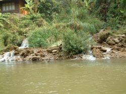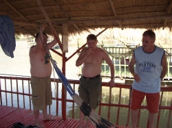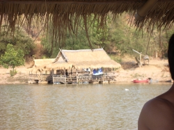 Nun war es Zeit für den Abschluss unseres Aufenthaltes, unserer Floßfahrt. Der Wasserstand war noch optimal, und so wurden wir zu den Flößen geführt. Ich stand natürlich gleich mal mit einem Fuß im Wasser. Aber da das Wasser warm wie eine Badewanne und die Außentemperatur schon wieder 30 Grad betrug, war dies nicht weiter schlimm. Das Floß bestand aus zusammen gebundenen Bambusstäben, auf die kleine Bänke angebracht waren. Ca. 6 – 8 Menschen konnten auf ein Floß Platz nehmen. Es war eine beschauliche Fahrt den Fluss entlang, durch den wir vorher mit unserem Elefanten geritten waren. So nebenbei kam eine Frau vorbeigelaufen mit einer Kühltasche voller Getränke. Das sah schon ulkig aus, wie die diese Tasche in einem großen Gummireifen platziert hatte, damit er nicht untergeht. Ihr selbst ging das Wasser etwa bis zur Taille. Auf einmal klingelte Udo´s Handy. Das war ein ganz und gar unpassendes Geräusch in dieser herrlichen Natur. Franz war am Apparat. Wir dachten den ganzen Vormittag, wir wären am Ende der Welt angelangt, aber ein Mobilnetz gibt es im hintersten Winkel, das ist wirklich mehr als erstaunlich, wenn man bedenkt, das wir in Teilen der Hinterpfalz keinen Handyempfang haben.