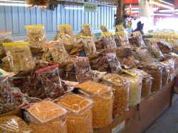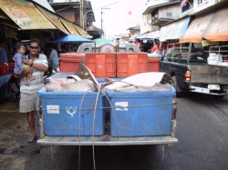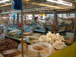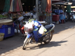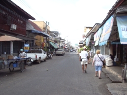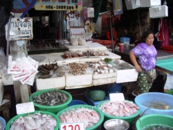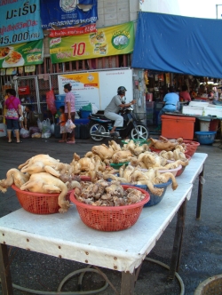 Nach dem Ausschlafen gegen 8:00 Uhr gingen wir zum Frühstück. Wir wollten heute nach Ban Pae um Geld zu holen, sowie eine Tasche für unseren Trip zu Wilai. Leider konnten wir den Shuttlebus vom Hotel nicht verwenden, da dieser schon voll war. Zuerst mussten wir auf den Hoteltechniker warten, da unser Tresor nicht mehr zu öffnen war. Es stellte sich heraus, dass wir das Ding zu voll gemacht hatten. Nun mussten wir mit dem Sammeltaxi in die Stadt fahren. Das hat auch super geklappt. In Ban Pae angekommen, liefen wir zuerst durch den großen Markt für Süßigkeiten und trockenen Fisch. Auch Muscheln in allen Formen und Arten konnte man hier kaufen. Wir machten uns weiter auf den Weg zum Fischmarkt. Vorher gingen wir zur Bank an den Automaten und wieder zum Fischmarkt. Heute bot sich ein ganz anderes Bild. Alles war ordentlich in Behälter mit Eiskühlung geschichtet und sah sehr appetitlich aus. Auch das Gemüse war ansprechend angerichtet. Nur das Fleisch und Geflügel war für unsere Augen gewöhnungsbedürftig. Es war sehr heiß, wir waren beide nass geschwitzt. Auf dem Rückweg fanden wir dann einen weiteren Optiker, bei dem Udo sich dann seine Brille kaufen konnte. Er war ganz stolz, dass er die Ladenbesitzerin von 2450 Baht auf 2000 Baht runter gehandelt hat. Nun aßen und tranken wir noch eine Kleinigkeit dann fuhren wir mit dem Sammeltaxi wieder zurück. Den Rest des Tages verbrachten wir am Strand. Nach dem Duschen holten wir dann die Blusen vom Schneider ab. Die Bluse für Irmgard war fantastisch. Dieser Stoff (Thaiseide) schimmerte in zich verschiedenen Farben. Auch die Bluse für Hildegard war sehr schön geworden. Wir hatten uns mit den Frankfurtern und Frau Panten dann noch zum Abschluss bei KIM verabredet, da die Frankfurter am Samstag und Frau Panten am Montag abreisen und wir ja erst am Dienstag wieder zurück kommen. Es war noch ein schöner Abend, wir haben die Adressen ausgetauscht und die Frankfurter haben uns noch den Blumenkorb übergeben, den Helga zum Geburtstag am 9.2. von ihrem Mann bekommen hat. Zum Abschluss des Tages packten wir noch unsere Tasche für unsere Reise. Aus der benachbarten Jugendherberge dröhnte laute Musik. Mal sehen, ob wir hier schlafen können. Morgen um 7:00 Uhr wollen Wilai und Franz kommen.