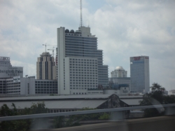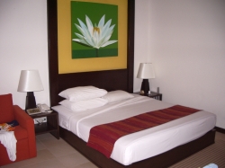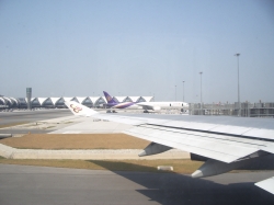 Unsere Landung am 5.Februar in Bangkok sorgte für Aufregung, da der Pilot kurz vor dem Aufsetzen noch mal durchstartete. Bei so einem kurzfristigen Start merkt man noch mal, was so ein Jumbo für eine Schubkraft hat. Beim zweiten Anlauf klappte es dann. Warum wir nochmals durchstarteten haben wir leider nicht erfahren. So konnten wir um 13:30 Uhr Ortszeit den Flieger in Bangkok verlassen. Die Zeitverschiebung beträgt 6 Stunden nach Osten, also waren wir schon später in der Zeit wie in Deutschland. Wie die eigentliche Außentemperatur war, konnten wir beim Aussteigen noch nicht fühlen, da der ganze Flughafen klimatisiert war. Nach Verlassen des Flugzeuges wurden wir schon von Jim, Wilais Schwester, Eg, Wilais jüngerer Sohn und Pui, Wilais Cousin (er arbeitet am Flughafen als stellvertretender Leiter des Cargobereiches) begrüßt. Eg hatte auch schon thailändische Telefonkarten für uns bereit, so dass wir gleich unsere Telefonnummern austauschen konnten. Der Flughafen in Bangkok ist riesig groß, laut Aussagen von Pui so groß wie in Frankfurt, nur ganz neu. Er hat uns dann auch durch den Zoll geführt, unsere Koffer waren auch in absolut kurzer Zeit dann auf dem Laufband. Nach der Gepäckausgabe wurden wir bereits von einer Reiseleiterin von Neckermann erwartet, so dass wir uns relativ schnell von Franz und Co. Verabschieden mussten. Mit einem Privatfahrzeug wurden wir dann zu zweit 40 Min. durch Bangkok gefahren zu unserem Hotel Manhattan. Die Zimmer im Hotel, na ja, für eine Nacht geht es. Wir hatten jedoch keine Handtücher.