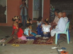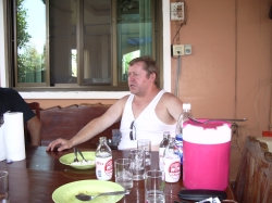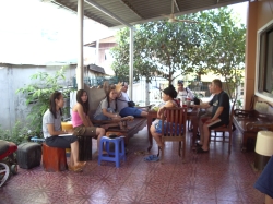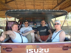Heute hatte Helmut Geburtstag. Wir sind so gegen 8:30 Uhr aufgestanden. Beim Kaffeetrinken haben wir erfahren, dass Pui bis 21:30 Uhr gearbeitet hat und Fam. Koch von 17:30 Uhr bis dahin in seinem Büro gesessen und gewartet hat. Wir ließen es langsam angehen und schauten uns das Gelände an. Das waren bestimmt so 15 – 20 a. An der Grundstücksgrenze war noch ein kleines Haus gebaut, welches von Wilais Bruder bewohnt wurde. Davor war mehr oder weniger eine Hütte, in der wohnt Wilais Schwester mit ihrem Mann und Kinder. An dem Gebäude angehängt war eine Art Garage, in der Phon, der Mann von Jim und unser Fahrer, ein Internetcafé betreibt. Das Café war die ganze Zeit, die wir da waren, gerammelt voll. Neben am Haupthaus war eine Thaiküche angebaut, sowie davor ein Bambusuntersitz. Hier hielten sich die Frauen auf beim Frühstücken. Als ich gerade beim Tagebuch schreiben war, hat mich Shu Pong gefragt, ob ich mit zum Markt fahren will. Ich bin spontan mitgefahren mit dem Motorroller. Ohne Helm! Das war interessant. Da sie Englischlehrerin war konnten wir uns relativ gut verständigen. Zuerst sind wir zu Jim in den Laden in der Stadt gefahren. Shu Pong wollte T-Shirts für die Kinder kaufen zum chinesischen Neujahrsfest, das am 18.2. gefeiert wurde. Dann sind wir zum Markt gefahren. Hier haben wir alle Lebensmittel zum Kochen eingekauft. Mit dem Fleisch hatte ich schon mein Problem. Nun wurde alles auf den Roller gepackt und weiter ging die Fahrt zum öffentlichen Schwimmbad. Dann zu diversen Sehenswürdigkeiten wie einem Tempel, einer riesigen Buddhastatue, ein großes Bild vom ihrem König. Bei Shu Pong kam wieder der ganze Stolz auf den König hervor. Dann ging es wieder zurück nach Hause. Dort wollte ich eigentlich ausruhen. Die Männer hatten jedoch schon mit Wilais Bruder ausgemacht, dass er eine Stadtrundfahrt mit ihnen in seinem Pick-up macht. Shu Pong und ich haben uns dann auch angeschlossen. Zuerst ging es auf seine Schweinefarm. Dort haben die Männer ein Schwein ausgesucht, welches abends gegrillt werden sollte zur großen Party. Im Stall neben den Schweinen wurde Reis geschrotet. Das war interessant zu sehen. Der Reis wurde wieder an die Bauern zurück gegeben, der Schrot an die Schweine verfüttert. Dann ging es weiter zu Jims Laden. Dort haben wir uns relativ lange aufgehalten. Die Männer sind mit Shu Pong auf den Markt gelaufen und Udo hat dort eine Tasche gekauft. Wir haben in der Zwischenzeit getrunken. Spy hieß das Getränk, war so ein Mixgetränk das geschmeckt hat wie süßer roter Sekt. Nachdem die Männer wieder zurück waren, machten wir noch eine Sightseeingtour. Die Männer saßen auf der Ladefläche des Pick-up, wir Frauen durften in den Fonds sitzen. So gegen 13:00 Uhr waren wir dann wieder zurück, die anderen Frauen waren jedoch fort zur Kosmetik und kamen erst so gegen 17:30 Uhr zurück. Franz und Burkhardt haben Frusttrinken gemacht. Zwischenzeitlich wurde von den anderen alles für die Party angerichtet. Das Schwein wurde fertig präpariert gebracht, in Bananenblätter gewickelt und auf den „Grill“ gelegt. Der Grill war eine abgesägte Tonne, auf der Wellblech lag, also ganz primitiv. Es gab essen im Überfluss. Vor allem gegrillte Fleischspieße mit einer köstlichen Soße. Zu trinken gab es in erster Linie Wiskey-Soda. Die Kinder hatten sich viel Mühe gegeben und einen Thaitanz einstudiert. Geschminkt mit Kostümen sahen sie aus wie kleine Tempeltänzerinnen. Das war wirklich eine ganz tolle Idee und Wilais Bruder hat dazu noch ein Schild in Thai gemalt, was übersetzt „Herzlich Willkommen in Phishabun „ heißt. Der Abend war feucht-fröhlich mit viel Gesang (Karaoke), Tanz und viel, viel essen. Jim war besonders gut drauf. Burkhardt hatte so eine Granate, der wusste schon gar nicht mehr, was er so alles redete. Heute Abend lernte ich noch ein paar Worte in Thai Mai pe rai (lei) = macht nichts; Joglika = Prost!; Mai au = fertig, ende; Mau = betrunken; MauMau = noch betrunkener!. Um 1:00 Uhr morgens gingen wir dann ins Bett. Wir haben so viele Leute kennen gelernt, die Namen konnten wir uns gar nicht alle merken. Die Toilette war wohl ein Wasserklosett, doch der Druck der Spülung war so schwach und die Abwasserleitungen so dünn, dass Toilettenpapier tabu war. Dafür war eine Handbrause an der Toilette angebracht zum Popo abspritzen. Wir hatten beide damit so große Probleme, dass sich unsere Verdauung kurzerhand ausschaltete. Aber ansonsten war es ein ganz toller Abend, der so richtig die Lebensart der Thai zeigte. Wir hatten bei unheimlich viel Spaß.