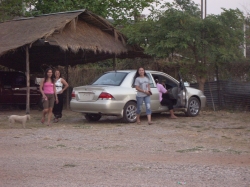 In Praeh angekommen mussten wir noch ca. 10 Min. laufen und kamen dann an unser Restaurant. Dort gab es wieder ein Super-Essen. Zum ersten Mal wurden frische Mango serviert. Tha Nu erklärte uns, dass der Ersatzbus nun zu unserem Bus fährt und unser Gepäck holt. Nach dem Essen hieß es dann, dass der Ersatzbus einen Umweg gefahren ist und so gegen 14.30 Uhr da sein wird. Wir sind dann Praeh einkaufen gegangen mit den Bayern. Als wir wieder zum Restaurant kamen, erklärte uns Tha Nu, dass es jetzt noch 30 Minuten dauern würde. Als die Zeit um war, kam ein Anruf vom Ersatzbus, er habe einen gerissenen Keilriemen und muss erst in die Werkstatt. „Murphys Gesetz“ dachten wir nur. Unser Tha Nu war nun sauer und organisierte einen Bus einer ortsansässigen Busfirma. Und nun kam er, unser „Traumbus Surprise“!! Ganz in Pink ausgestattet mit rose Vorhängen und bunten Lampen. Mit diesem Bus fuhren wir dann die Sehenswürdigkeiten von Praeh wie das Teakhaus und einen Tempel ab.