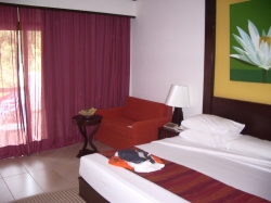 Um ca. 16.00 Uhr kamen wir am Flughafen an. Die Weiterflieger zu den Inseln stiegen hier aus, wir durften sitzen bleiben. Und weiter ging es in Richtung Rayong. Ca. 20 km vor Pattaya wurden wir noch mal geteilt, unsere Freunde aus Bayern mussten in einem Minibus umsteigen. Dann endlich um 18.35 Uhr kamen wir im Novotel an. Die Dänische Famili8e fuhr noch weiter. Am Empfang wurden wir von der stellvertretenden Hotelchefin Susanne begrüßt. Da sie Deutsche war, war das Einchecken relativ leicht. Der einzige Wermutstropfen war, dass wir natürlich wieder getrennte Betten hatten. Susanne versprach uns am Montag ein Zimmer mit Kingsize-Bett. Nachdem wir endlich duschen konnten, hatten wir keine Lust mehr, aus unserem Herrlich klimatisierten Zimmer zu gehen. Deshalb ließen wir uns unser Essen für 420 Baht auf das Zimmer bringen. So endete unser erster Tag an unserem weiteren Urlaubsort.
